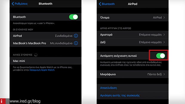 Η αυτόματη ανίχνευση αυτιού είναι ενεργοποιημένη από προεπιλογή, με αυτή την λειτουργία τα AirPods σταματούν αυτόματα την αναπαραγωγή όταν τα αφαιρείται από τα αυτιά σας και συνεχίζουν όταν τα επανατοποθετείτε. Σε μερικές περιπτώσεις μπορεί να σας φαίνεται αρκετά χρήσιμο όμως κάποιες φορές μπορεί να σας φανεί εκνευριστικό. Για την ενεργοποίηση ή απενεργοποίηση της λειτουργίας μεταβείτε στις Ρυθμίσεις > Bluetooth > Επιλέξτε το i δίπλα από τα AirPods > Επιλέξτε ενεργοποίηση ή απενεργοποίηση της αυτόματης ανίχνευσης αυτιού