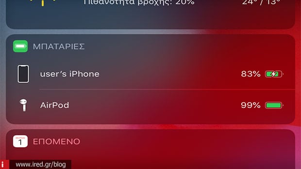 Στο iPhone για να δείτε πόση μπαταρία σας έχει απομείνει μπορείτε αν δεν τα χρησιμοποιείτε απλά να ανοίξετε την θήκη ώστε να εμφανιστούν τα AirPods και η μπαταρία που σας απομένει στην οθόνη σας. Σε περίπτωση που θέλετε να το ελέγξετε κατα την διάρκεια χρήσης μεταβείτε στην οθόνη των widget επιλέξτε επεξεργασία, επιλέξτε το πράσινο εικονίδιο + δίπλα στο widget Μπαταρίες και στην συνέχεια πατήστε Τέλος. Με αυτόν τον τρόπο, όποτε τα AirPods είναι συνδεδεμένα στο iPhone σας θα μπορείτε να ελέγξετε την μπαταρία που σας απομένει μέσω του Widget.