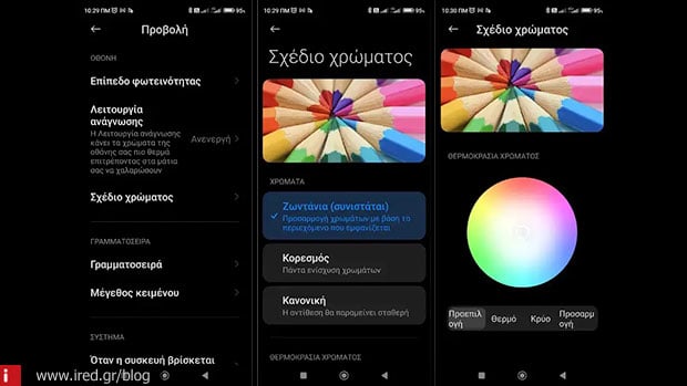 Μια άλλη ρύθμιση της οθόνης Android που πρέπει να αλλάξετε είναι τα χρώματα. Στο MIUI θα το βρείτε στις Ρυθμίσεις > Προβολή > Σχέδιο χρώματος. Μπορείτε να τα ρυθμίσετε να φαίνονται ζωντανά, με κορεσμό (με ενίσχυση), ή κανονικά (φυσικά). Λίγο πιο κάτω θα βρείτε και την θερμοκρασία Χρώματος. Εδώ οι επιλογές είναι θερμό, κρύο και προσαρμογή (με βάση μία παλέτα χρωμάτων σε ένα κύκλο).