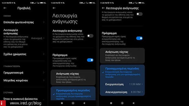 Στις Ρυθμίσεις > Προβολή, και στην ενότητα Οθόνη, θα βρείτε την λειτουργία ανάγνωσης. Είναι μία πολύ καλή ρύθμισης όπου το τηλέφωνό σας κάνει τα χρώματά του πιο θερμά, επιτρέποντας έτσι να χαλαρώσουν τα μάτια σας από τον έντονο φωτισμό. Μπορείτε να ρυθμίσετε την λειτουργία να είναι συνέχεια ανοικτή ή μπορείτε να την προγραμματίσετε υπό κάποιες συνθήκες. Είτε με την δύση και την ανατολή του Ηλίου, είτε σε συγκεκριμένες ώρες, ας πούμε από τις 10:00 το βράδυ μέχρι τις 07:00 το πρωί.