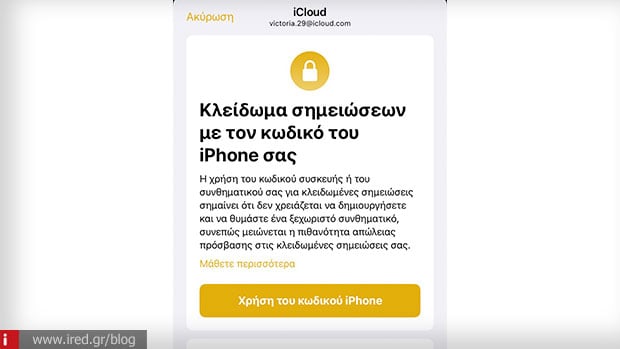 Μπορείτε να κλειδώσετε μία από τις σημειώσεις σας χρησιμοποιώντας τον κωδικό της συσκευής σας ή επιλέγοντας συγκεκριμένο συνθηματικό για τις κλειδωμένες σημειώσεις. Με την δυνατότητα χρήσης του κωδικού της συσκευής δεν χρειάζεται να δημιουργήσετε και να θυμάστε κάποιο ξεχωριστό συνθηματικό, συνεπώς μειώνεται η πιθανότητα απώλειας πρόσβασης των σημειώσεων.