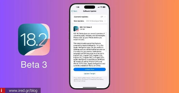 Η beta 3 του iOS 18.2 που κυκλοφόρησε περιλαμβάνει μια σειρά νέων λειτουργιών και βελτιώσεων, κυρίως σε εφαρμογές, ρυθμίσεις και την εμπειρία χρήστη.