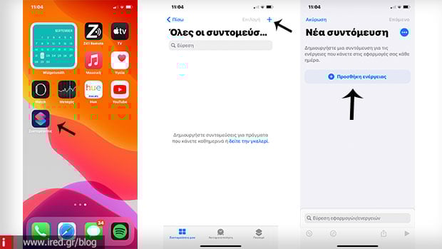 2. Πατήστε + πάνω δεξιά για προσθήκη νέας συντόμευσης