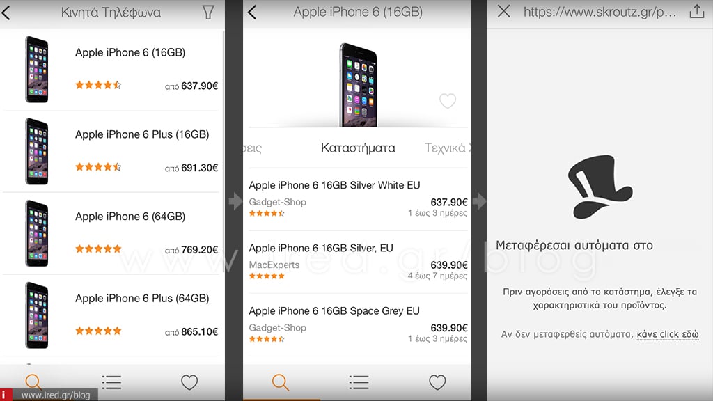 Επιλέγοντας το μοντέλο που ψάχνουμε, βλέπουμε τα καταστήματα που το διαθέτουν και την τιμή ανά κατάστημα, όπως επίσης και τις βαθμολογίες των καταναλωτών ανά μοντέλο, ανάλογα με το πόσο ευχαριστημένοι έμειναν με την αγορά του.