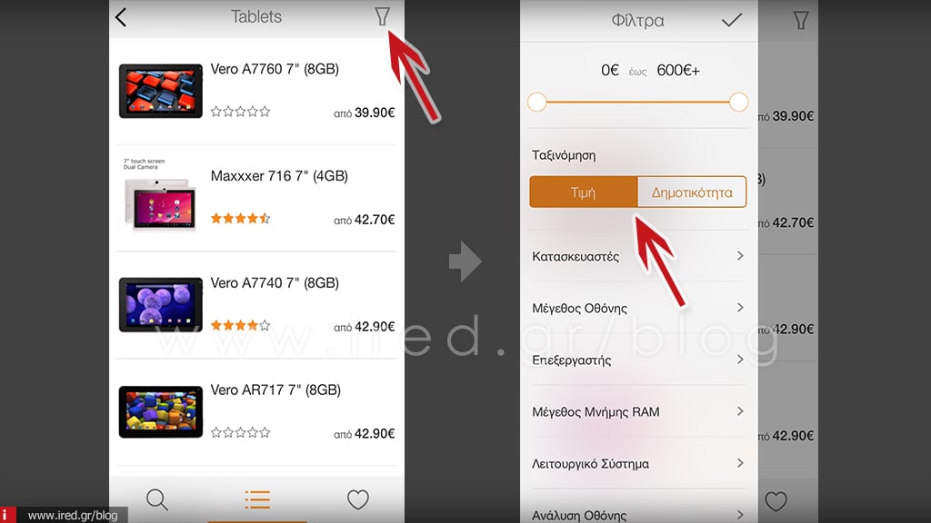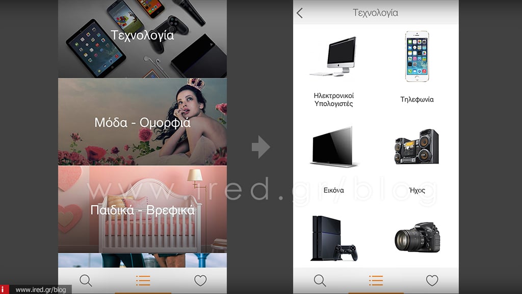 Η μεσαία καρτέλα, μας επιτρέπει να αναζητήσουμε προϊόντα με βάση την κατηγορία. Όταν επιλέξουμε από τις διαθέσιμες κατηγορίες, θα εμφανιστούν σχετικές υποκατηγορίες αλλά και οι υποκατηγορίες αυτών. Στο τέλος, θα εμφανιστούν τα προϊόντα που αναζητούμε. Έχουμε την δυνατότητα να πλοηγηθούμε ξεκινώντας από το προϊόν με την χαμηλότερη τιμή αλλά και να χρησιμοποιήσουμε φίλτρα αναζήτησης επιλέγοντας το σχετικό εικονίδιο στο επάνω – δεξί άκρο της οθόνης.