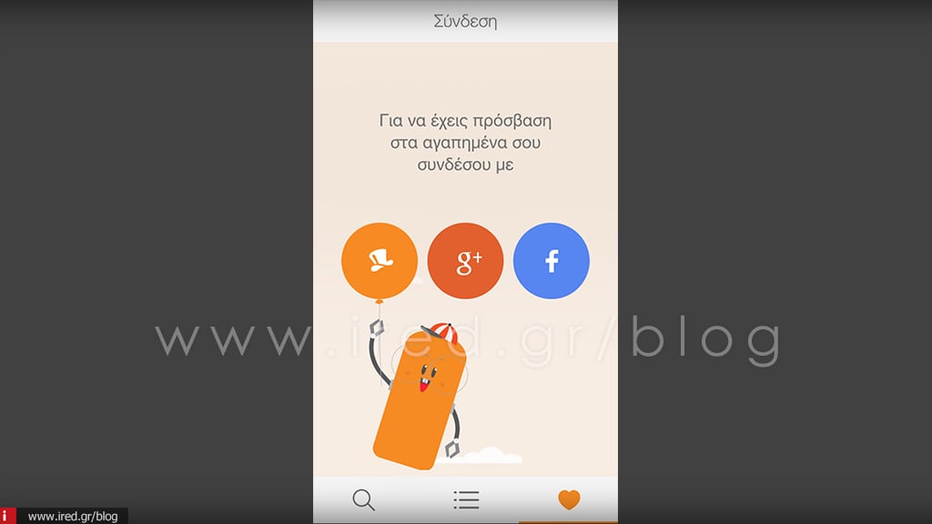 Η εφαρμογή είναι εξαιρετικά λιτή και δεν θα “χαθείτε” ποτέ. Κατά το άνοιγμα βλέπουμε (στο κάτω μέρος της οθόνης) τρεις διαθέσιμες καρτέλες για να επιλέξουμε μεταξύ αναζήτησης, κατηγοριών και αγαπημένων. Αυτόματα η εφαρμογή ξεκινάει από το πρώτο tab, την αναζήτηση.