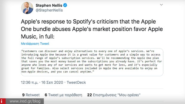 To Spotify έχει κατηγορήσει στο παρελθόν την Apple για εκμετάλλευση της δύναμης της και για την χρήση μονοπωλιακών επιχειρηματικών πρακτικών. Αμέσως μετά από τις χθεσινές ανακοινώσεις της Apple μέρος των οποίων ήταν και το Apple One, το Spotify μοιράστηκε την αντίδραση του μέσω του δημοσιογράφου Cheddar J.D. Durkin ο οποίος δημοσίευσε στο Twitter.